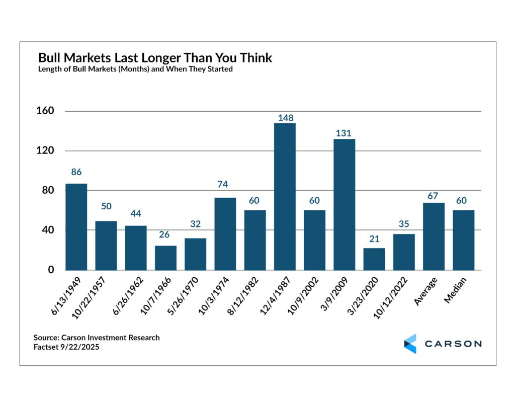 With markets once again at all-time highs and a steady climb from April lows, investors seem to be on edge, questioning sustainability. While the catalysts for this current bull market may be new as it approaches 36 months from late 2022, the overall length of positive performance remains well within range of typical bull market rallies.