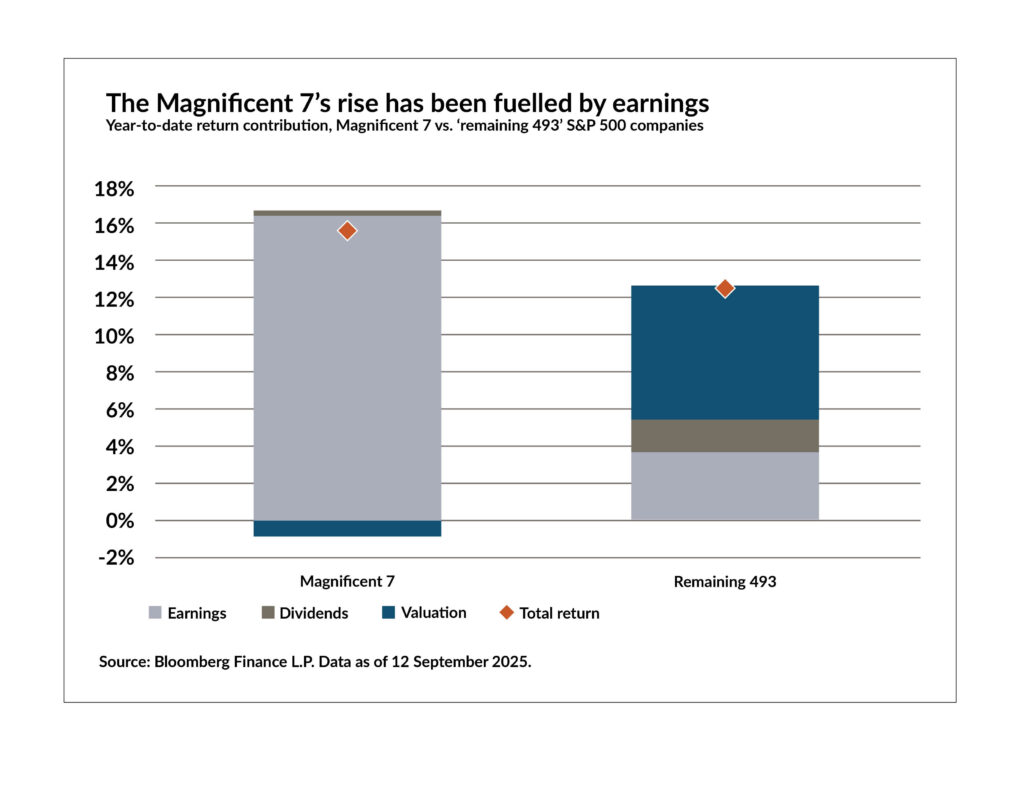 The main drivers of U.S. equity performance remain similar to 2023 and 2024, with the largest companies growing at an above average pace driven by continued investment in Artificial Intelligence (AI). The Magnificent Seven concentration continues to drive overall returns, with some evidence of improved participation from the remaining 493 companies of the S&P 500.