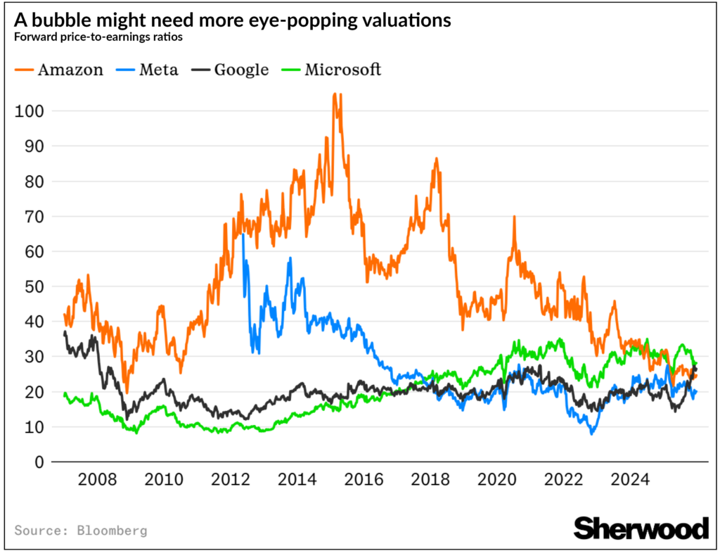 Spending heavily to protect these already valuable, highly profitable, low-debt companies could be justified as an insurance policy — even if AI ultimately adds little new value. In September, Meta CEO Mark Zuckerberg summarized it well: “If we end up misspending a couple hundred billion dollars, I think that is going to be very unfortunate, obviously, but… I actually think the risk is higher on the other side.” He may be wrong in the end, but it’s not hard to see the logic from his seat helming a trillion-dollar company with a healthy balance sheet seeking new growth opportunities.