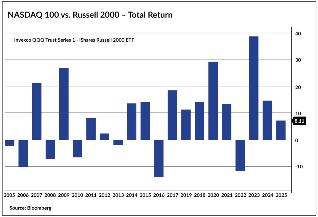 The chart below shows the gap between the annual performance of the tech-heavy NASDAQ-100 (as measured by the QQQ ETF) minus the performance of the Russell 2000 (as measured by the IWM ETF). Broadly, while big tech has outperformed several smaller companies, it’s quite narrow: Big tech has only outperformed small caps by ~8% this year.