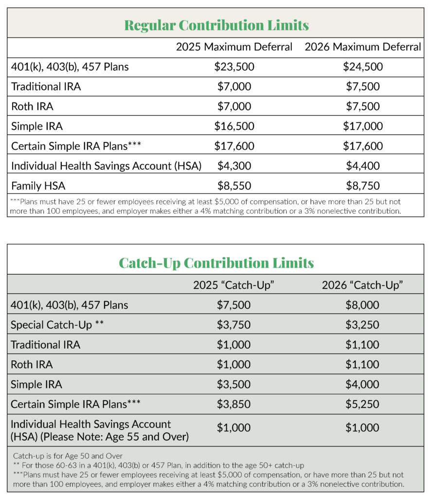 Some SIMPLE plans are allowed higher deferral limits. Participants in certain SIMPLE 401(k) and SIMPLE IRA plans can take advantage of an increased deferral limit of $17,600 and an increased catch-up limit of $3,850 (both unchanged from 2025) if their employer meets one of the following conditions:
